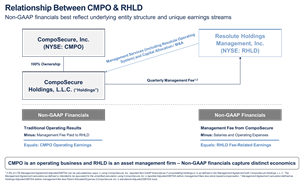 As a result of the spin-off from CompoSecure and execution of the Management Agreement with CompoSecure Holdings, Resolute Holdings is required to consolidate the financial results of CompoSecure Holdings in accordance with U.S. GAAP. This presentation of financial results does not represent the underlying economics or the positive attributes of Resolute Holdings’ standalone business model, which consist of recurring, long-duration management fees and a relatively fixed expense base. The results of the Resolute Holdings standalone business and associated Non-GAAP Fee-Related Earnings calculation are included below to provide a clear picture of the economic performance of the business directly attributable to shareholders of RHLD. This release includes such results presented in accordance with U.S. GAAP, as well as certain Non-GAAP measures, including Fee-Related Earnings. See “Use of Non-GAAP Financial Measures” below.